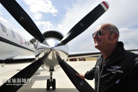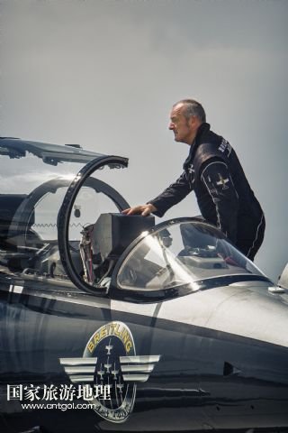 8月14日,在新疆克拉瑪依機(jī)場(chǎng),百年靈噴氣機(jī)隊(duì)隊(duì)長雅克在保障機(jī)前向隊(duì)友致意。