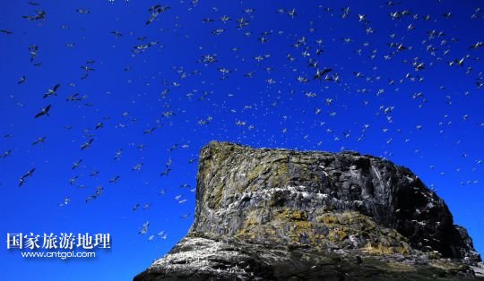 登上圣基爾達(dá)島并非易事,記者因風(fēng)高浪大在外赫布里底群島等待多日才有船出海。僅可乘載10余人的小船在風(fēng)浪中穿行了近3個(gè)小時(shí),圣基爾達(dá)島終于出現(xiàn)在霧色籠罩的海面上。島上散落著十余座已經(jīng)荒蕪破敗的石舍和幾百個(gè)儲(chǔ)物石室,這些殘存的遺跡早已成為野羊與海鳥的巢穴,人類反而成為外來的訪客。人類文明的消失為一些稀有的物種和瀕臨滅絕的鳥類提供了安全的棲息地。島上陡峭的山坡隨處可見野羊悠然漫步,而那些嶙峋的峭壁和海礁則棲息著數(shù)十萬(wàn)只各類海鳥。世界上最大的塘鵝群——約6萬(wàn)對(duì)塘鵝在這座海島及附近的海礁上繁衍生息。