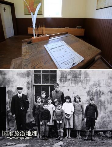 上圖,圣基爾達(dá)島上只有一個(gè)教室,一排課桌的小學(xué)校內(nèi)景(7月19日攝)。學(xué)校后來經(jīng)過重新整修。下圖,當(dāng)年島上學(xué)校師生的合影(資料照片,蘇格蘭國(guó)家信托基金會(huì)提供)。