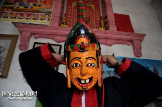 8月18日,譚圣慈戴上面具準(zhǔn)備為前來(lái)學(xué)習(xí)的小男孩演示儺面舞。