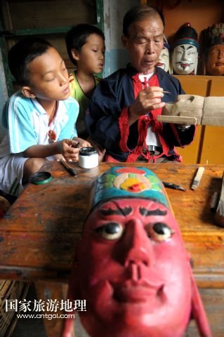 譚圣慈老人今年72歲,從22歲開(kāi)始學(xué)雕刻儺戲面具,迄今,已經(jīng)堅(jiān)持了50年。老人說(shuō),他制作的面具因工藝精湛,造型優(yōu)美,曾吸引遠(yuǎn)方的客人高價(jià)購(gòu)買。但是,卻少有人來(lái)學(xué)習(xí)面具的雕刻與制作。儺戲于2006年被列入非物質(zhì)文化遺產(chǎn)名錄之后,政府加大了保護(hù)力度,但因?yàn)槊婢叩闹谱髦芷陂L(zhǎng)、工序復(fù)雜,銷售渠道少等原因,仍無(wú)法吸引年輕人學(xué)習(xí)雕刻的興趣。為了收到心儀的徒弟,傳承這獨(dú)到的技藝,他到處發(fā)布免費(fèi)收學(xué)徒的信息。在他的堅(jiān)持下,今年暑期,鄉(xiāng)里有兩名對(duì)面具制作感興趣的男孩來(lái)到譚圣慈身邊學(xué)藝。老人高興地說(shuō):“我給他們講很多故事,就是希望他們能對(duì)此提起興趣,愛(ài)上木面雕刻,別讓這老手藝失傳了。” /新華社發(fā)