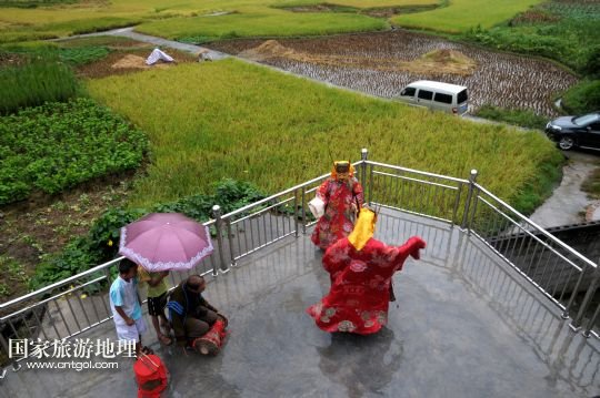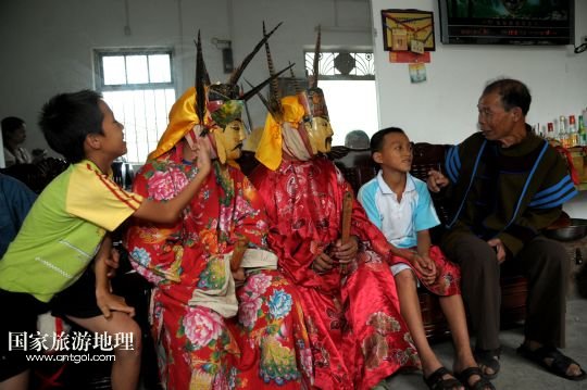 國(guó)家旅游地理 廣西河池8月19日訊 8月18日,譚圣慈老人(左一)帶著前來(lái)學(xué)習(xí)的兩名男孩跳儺面舞。在廣西北部與貴州交界一帶的我國(guó)唯一的毛南族自治縣——環(huán)江毛南族自治縣,神秘的儺戲被譽(yù)為毛南族的“族寶”。原始古樸、風(fēng)格獨(dú)特的儺戲是毛南族的民間傳統(tǒng)舞蹈,藝人在表演過(guò)程中經(jīng)常戴著被稱為儺面的木制面具。儺面一般高30厘米、寬20厘米,由毛南族藝人在民族口頭文學(xué)的基礎(chǔ)上依據(jù)個(gè)人想象創(chuàng)作,用優(yōu)質(zhì)木塊雕琢而成,共有文、武、善、兇四大類72種面相。