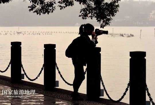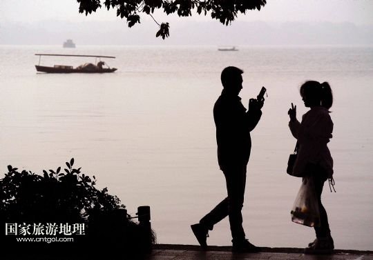國(guó)家旅游地理 浙江杭州11月5日訊 11月4日,一對(duì)男女青年在西湖邊拍照留影。生活在杭州的人是幸福的,因?yàn)楹贾萦形骱G宄康奈骱?,恬靜,淡雅,柔美,朦朧。岸邊,堤上,健身鍛煉的市民、散步賞景的游人,在湖水、小橋、亭閣、石欄的襯伴下,構(gòu)成了一幅幅剪影效果的水墨圖畫(huà)。 /新華社記者王頌攝