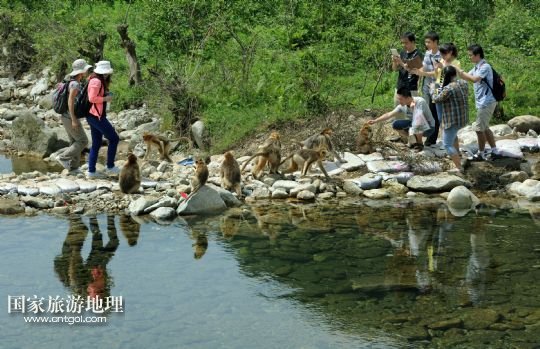6月22日,游人在華陽鎮(zhèn)與金絲猴親密接觸。