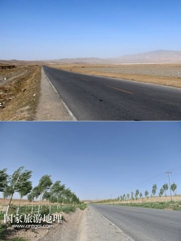 上圖上:2014年4月的資料照片上甘鹽池一片荒涼;上圖下:6月4日,記者拍攝的甘鹽池已是綠意盎然(拼版照片)。