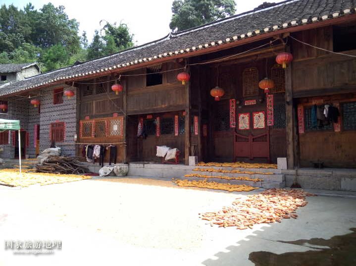 國家旅游地理  貴州黔南8月28日訊 (記者 萬棋民 攝影報道) 上圖是在黔南貴定縣的音寨,音寨是天下布依第一寨。音寨的民居依山而建,一層一層往山上延伸。從圖中可以看到,音寨民居一半是木制結構,另一半新建的則是磚石材質。這種新與舊的連接是兩個時代的接軌,反映了改革開放前與改革開放后隨著經(jīng)濟的發(fā)展,少數(shù)民族居民的居住環(huán)境和生活水平得到了極大的提升。在圖片右邊的木制房子大門的正上方,刻著三塊密密麻麻的字,上面刻的是毛澤東語錄,而且不只這一家的木制房子上刻有毛澤主席語錄,可以看出當?shù)鼐用駥γ飨木磹壑椤?br />