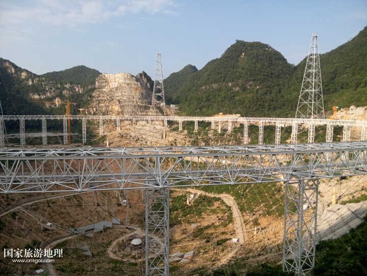 這是黔南平塘縣正在建設的大射電望遠鏡,也稱 FAST,預計將于明年九月建成。FAST具有中國獨立自主知識產(chǎn)權,是世界上正在建造及計劃中的口徑最大、最具威力的單天線射電望遠鏡,其設計綜合體現(xiàn)了我國高技術創(chuàng)新能力。500米口徑球面射電望遠鏡是利用貴州喀斯特地區(qū)的洼坑作為望遠鏡臺址,建造世界第一大單口徑射電望遠鏡,其擁有30個標準足球場大的接收面積。FAST作為世界最大的單口徑望遠鏡,將在未來20至30年保持世界一流地位。